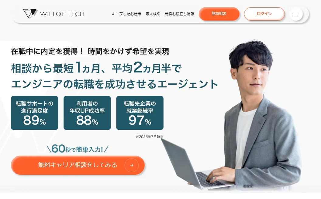 在職中でも利用でき、面談や面接はオンライン等で調整されることが多いです。WILLOF TECHも「一気通貫で転職活動をリード」「平均2か月で内定獲得」といった特徴があるため、忙しい人ほど相談価値があります。