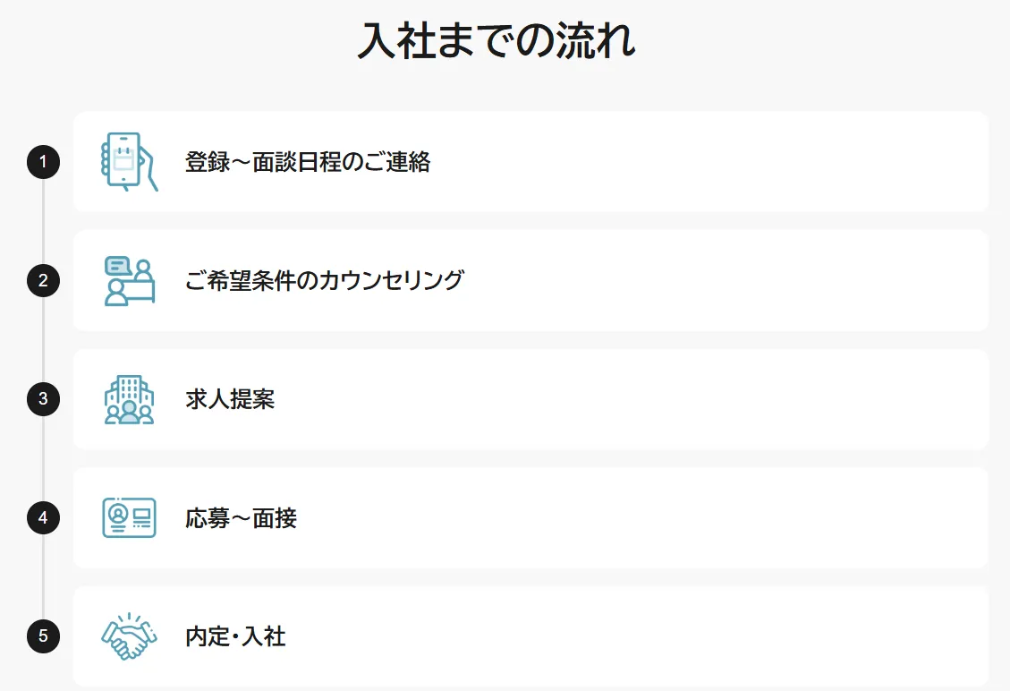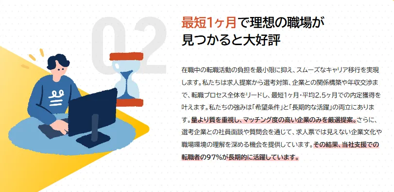 「平均2.5か月で内定獲得」「一気通貫で転職活動をリード」「希望条件と職場環境の両軸で厳選した求人を提案」といった特徴があります。一般的に在職中は時間が取れないため、進め方を伴走してもらえると停滞を防ぎやすいです。