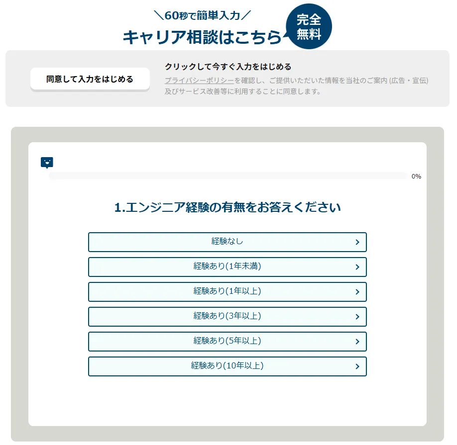 公式サイトから基本情報を入力し、無料相談の入口を作ります。現職の職種・年収・希望条件(年収/勤怠)を箇条書きにしておくと、初回面談が進みやすくなります(詳細フローは公式で要確認)。 まずは無料登録で相談を始める